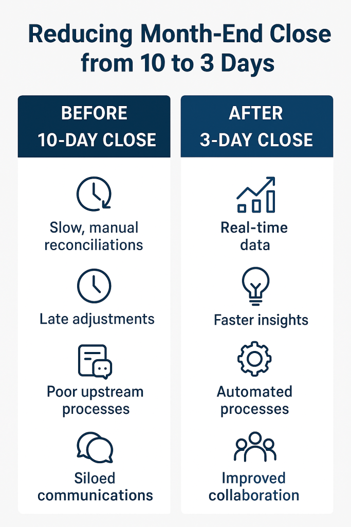 Reducing the month-end close from 10 days to 3 days is not simply a finance efficiency project — it’s a strategic enabler. It gives leaders fresher insights, creates space for forward-looking analysis, and signals to investors and employees that the company is agile and well-managed.